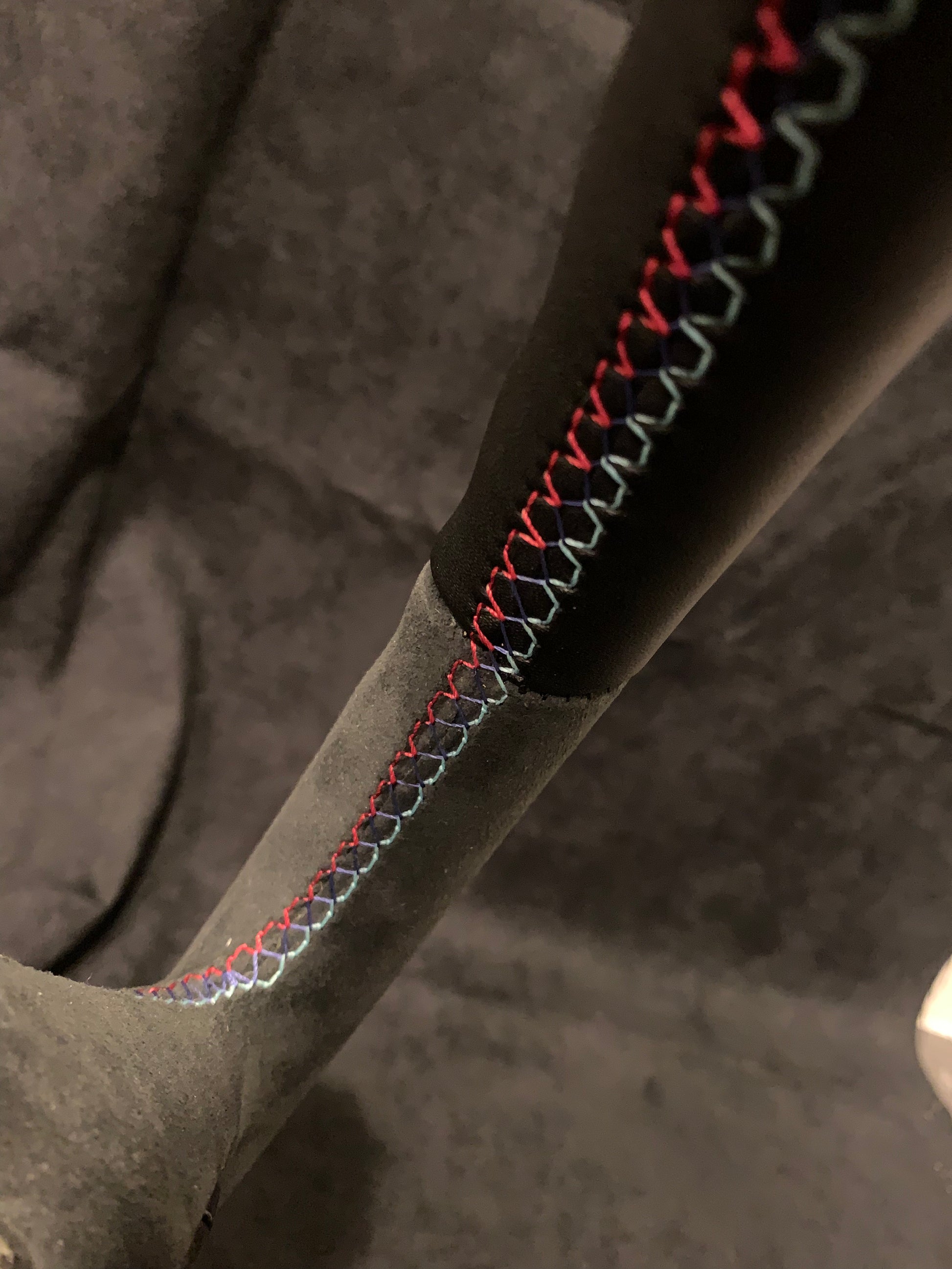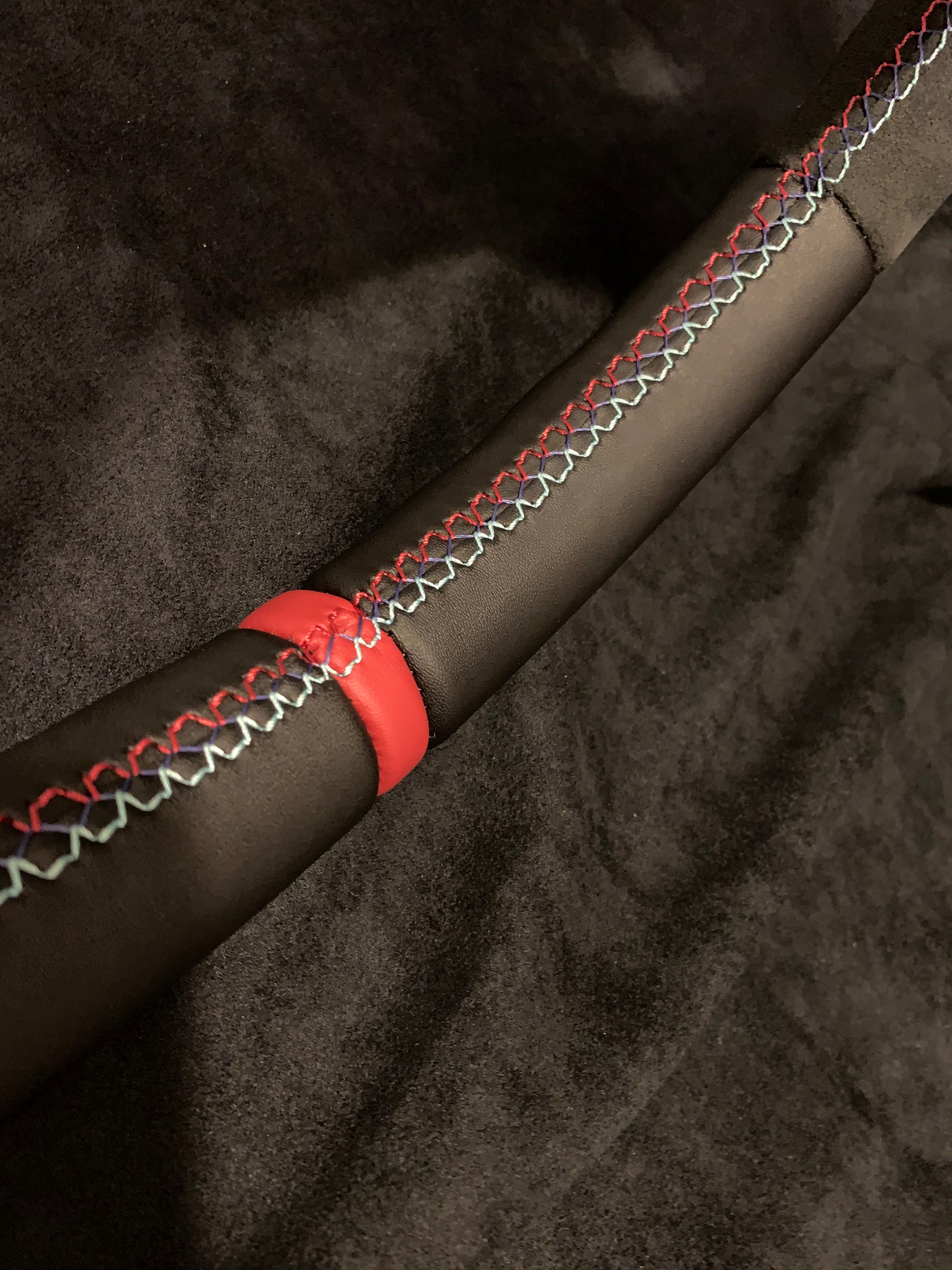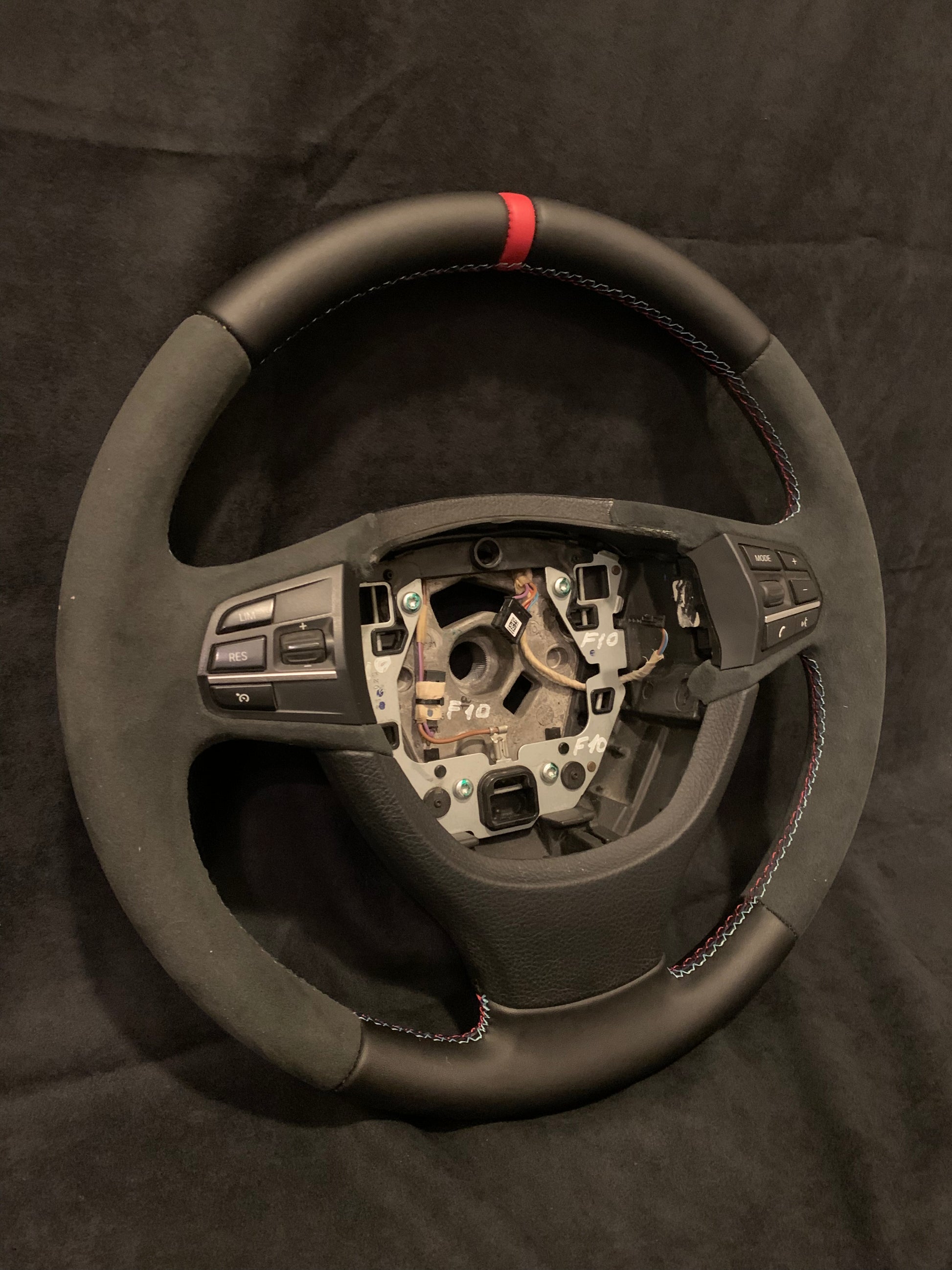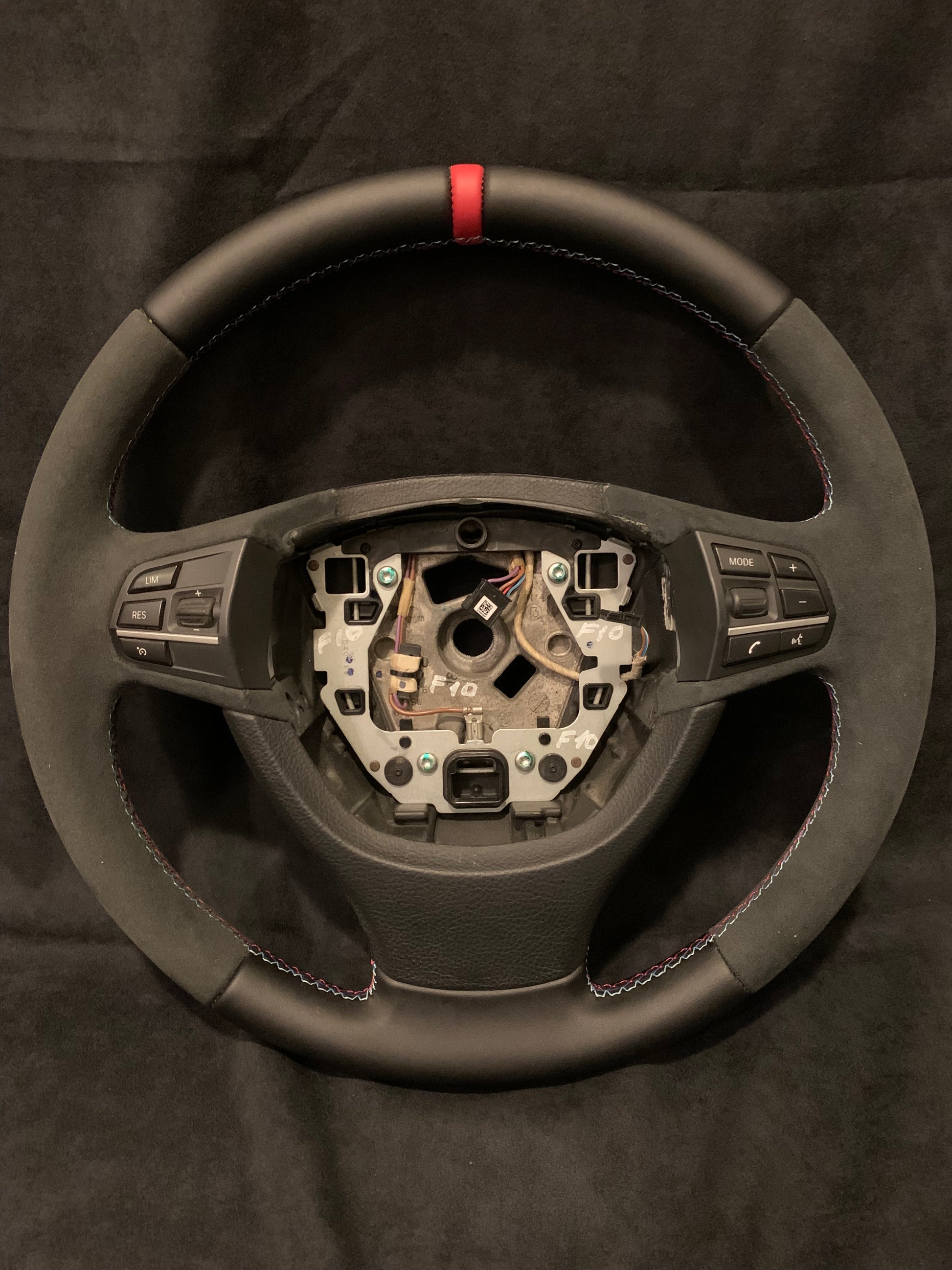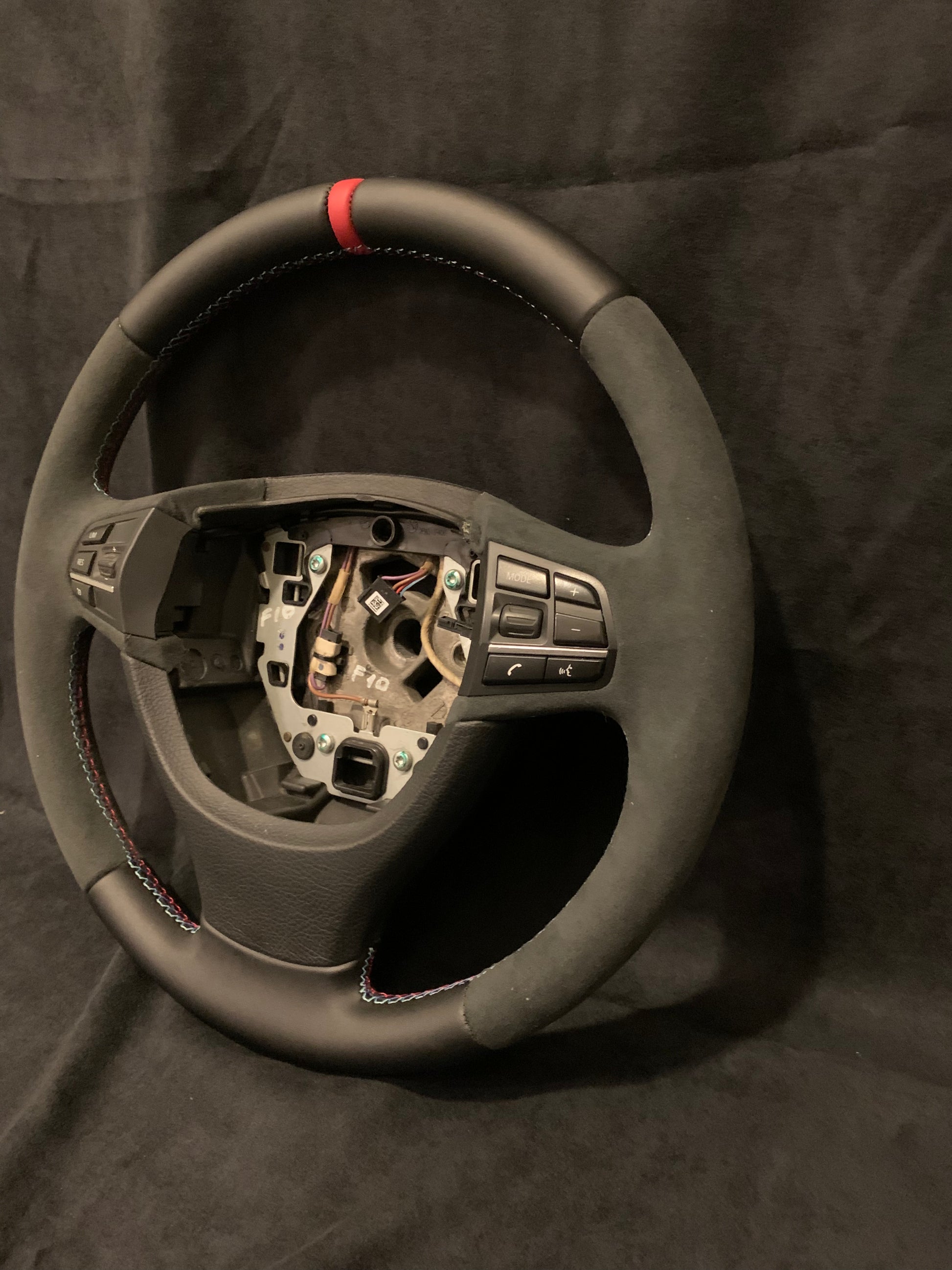 BMW F10 - Ratt Som är helt omsydd med äkta Alcantara på sidorna med slät läder uppe/nere med Röd Centrerings ring samt M-Sömmarna